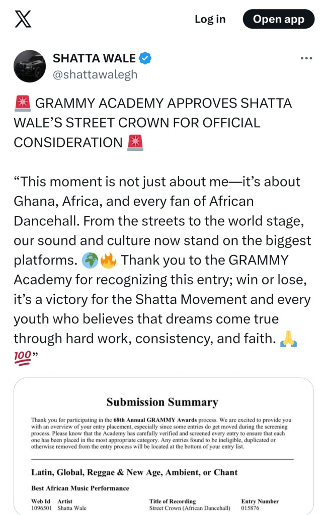 “Thank you to the GRAMMY Academy for recognizing this entry; win or lose, it’s a victory for the Shatta Movement and every youth who believes that dreams come true through hard work, consistency, and faith,” he added.