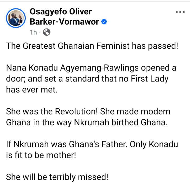 Social activist and lawyer Oliver Barker-Vormawor has paid tribute to the late Nana Konadu Agyemang-Rawlings, describing her as “the greatest Ghanaian feminist” following news of her passing.