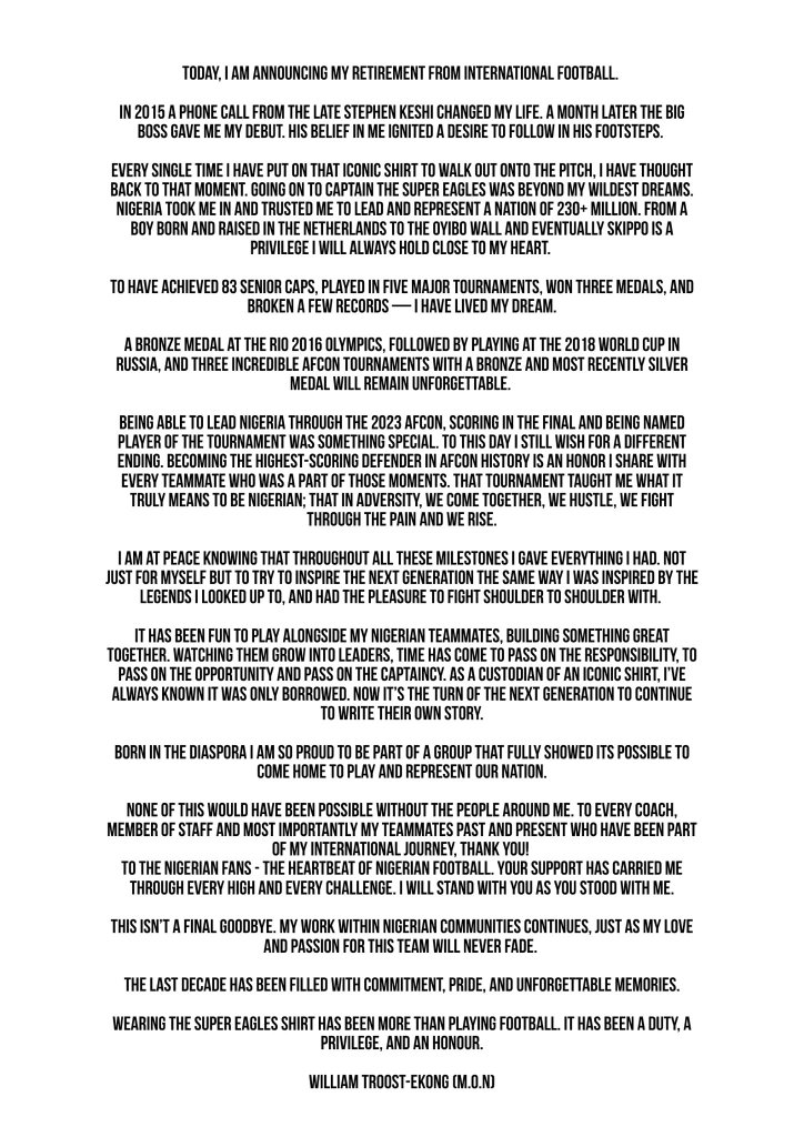 Nigeria’s skipper, Troost-Ekong William, has announced his retirement from international football.