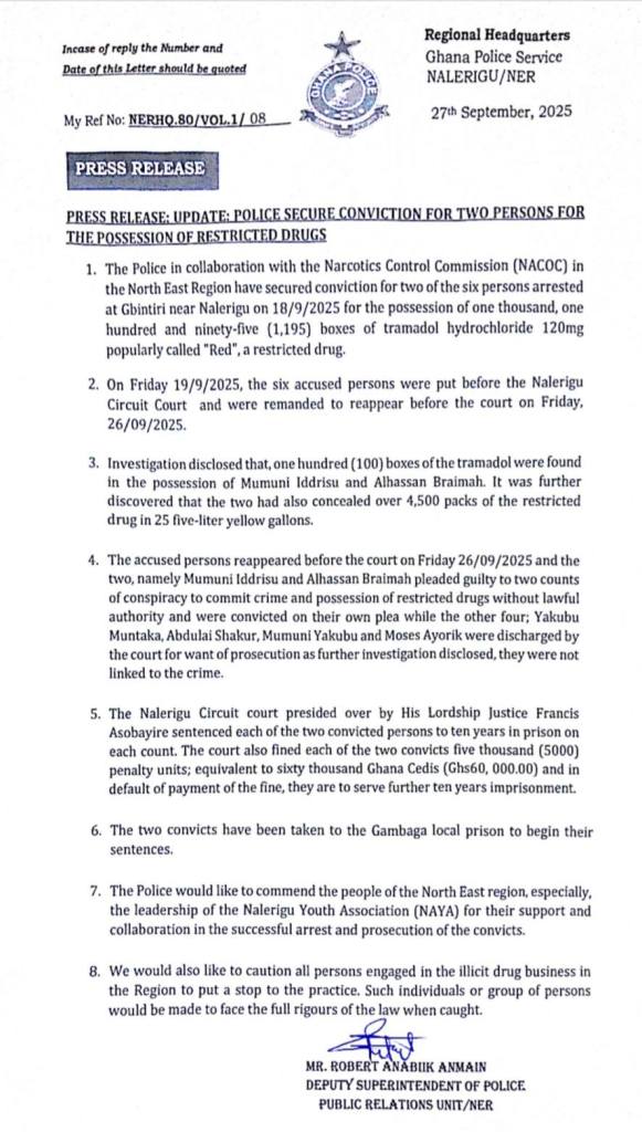 The Ghana Police Service in the North East Region has secured the conviction of two individuals for possessing restricted drugs, following a successful collaboration with the Narcotics Control Commission (NACOC).