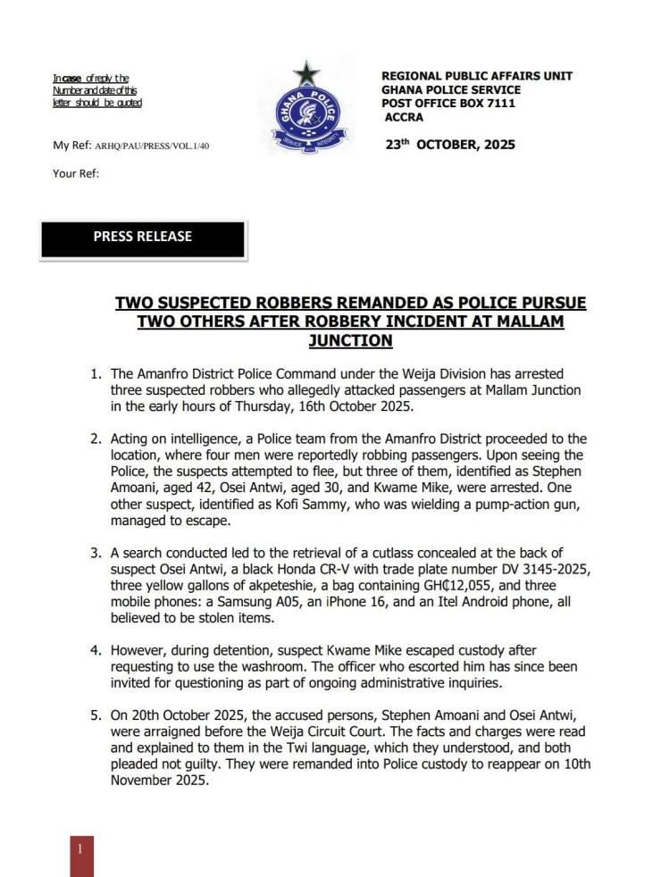 The Amanfro District Police Command under the Weija Division has remanded two suspects into custody following a robbery incident at Mallam Junction on October 16, 2025.