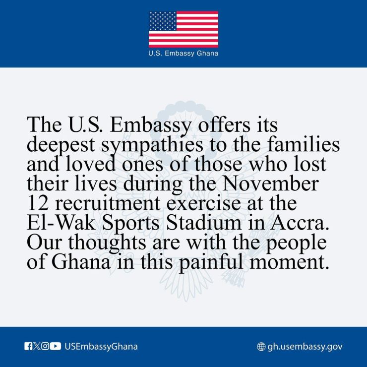 In a statement, the embassy said, “The U.S. Embassy offers its deepest sympathies to the families and loved ones of those who lost their lives during the November 12 recruitment exercise at the El-Wak Sports Stadium in Accra. Our thoughts are with the people of Ghana in this painful moment.”