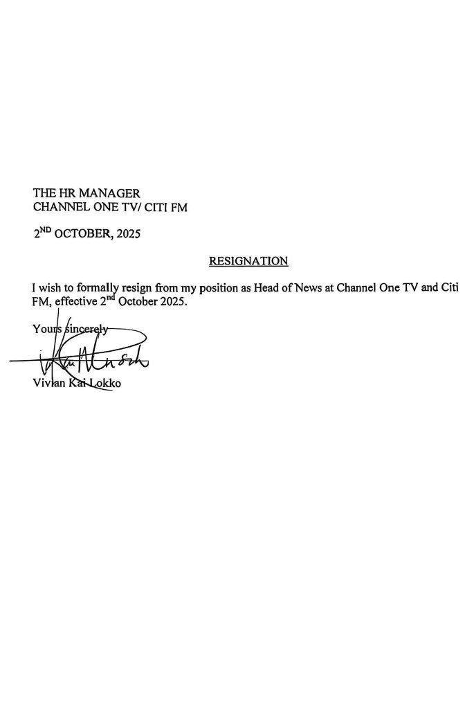 Vivian Kai Lokko has officially resigned from her position as Head of News at Channel One TV and Citi FM, effective October 2, 2025.