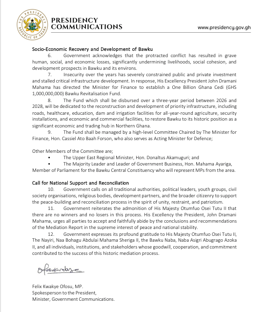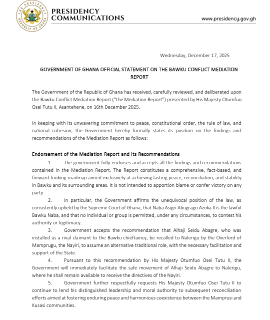 “The Government fully endorses and accepts all the findings and recommendations contained in the Mediation Report,” the statement said, stressing that the document is “fact-based, forward-looking and exclusively aimed at achieving lasting peace, reconciliation and stability in Bawku and its surrounding areas.”