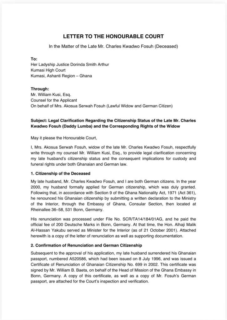 Through her counsel, Mr. William Kusi, Mrs. Akosua Serwah Fosuh wrote, “My late husband and I are both German citizens.