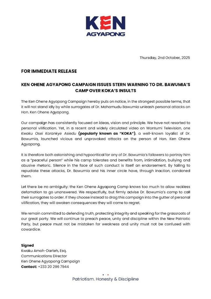 In a statement released on Thursday, October 2, 2025, the Ken Ohene Agyapong Campaign said it would not remain silent while personal insults are directed at their candidate.