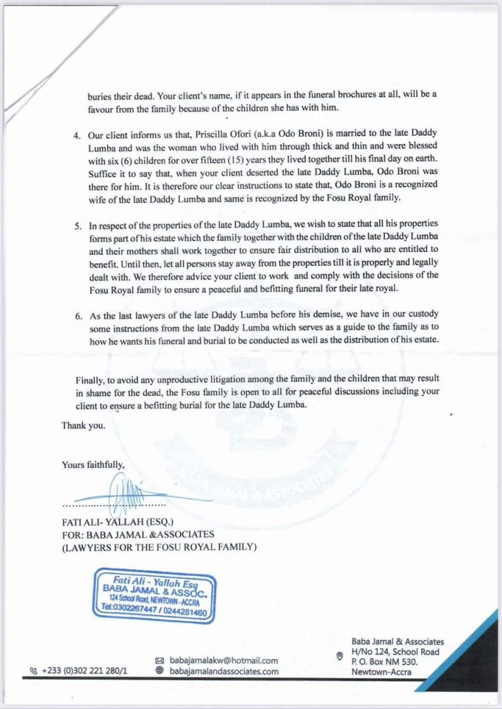 Lawyers for the family of the late Charles Kwadwo Fosu, known popularly as Daddy Lumba, have in a letter written to the wife of the late musician.
