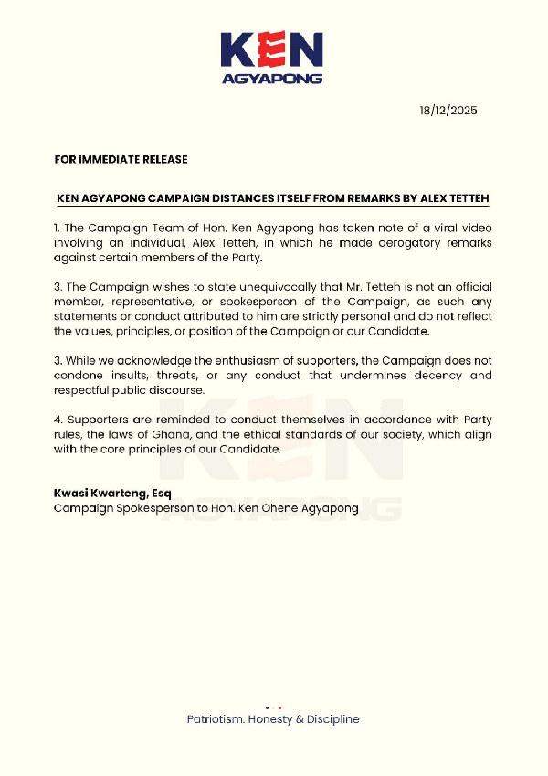 “The Campaign wishes to state unequivocally that Mr. Tetteh is not an official member, representative, or spokesperson of the Campaign,” the statement said, adding that any comments attributed to him are “strictly personal and do not reflect the values, principles, or position of our Candidate.”